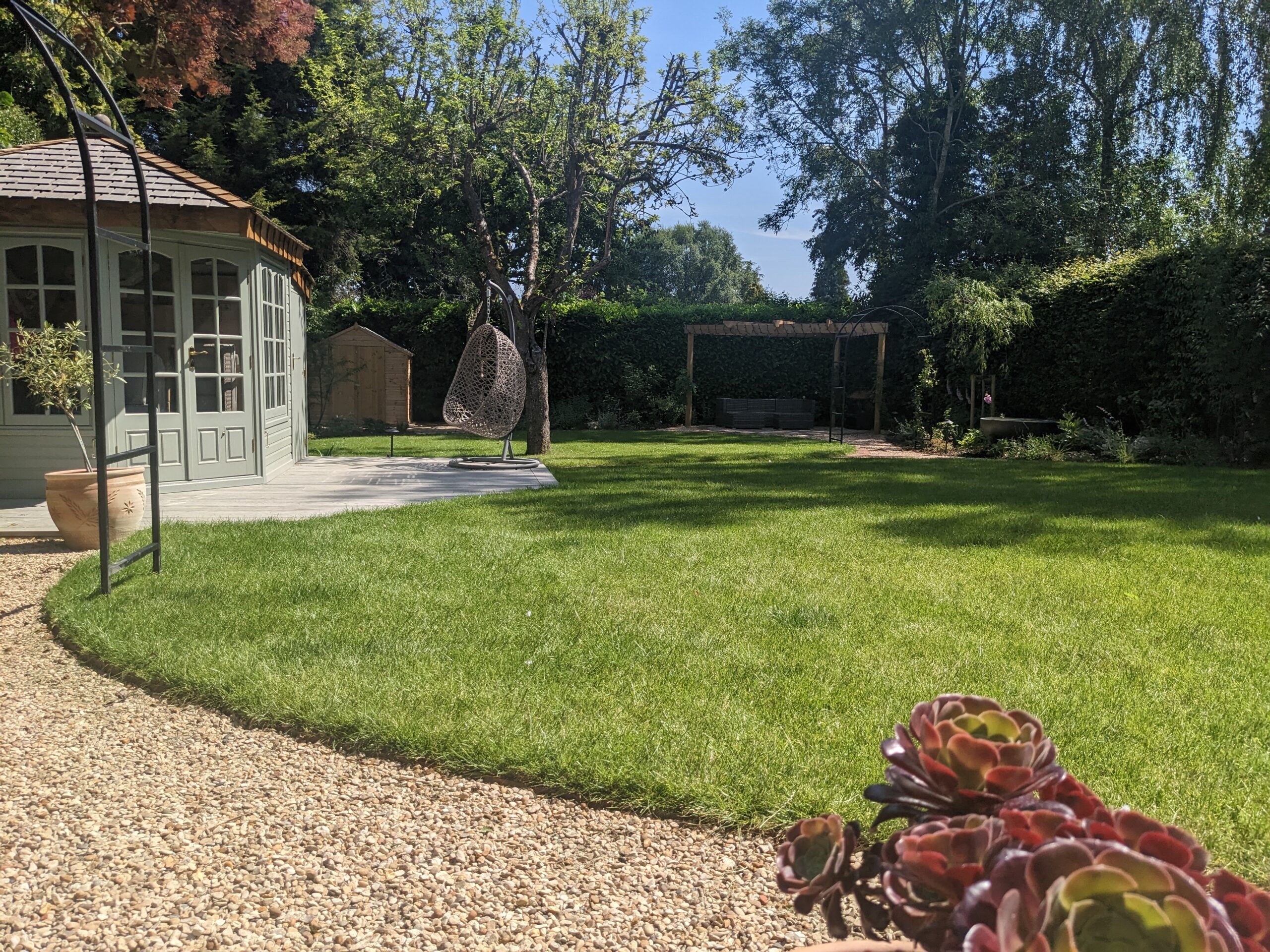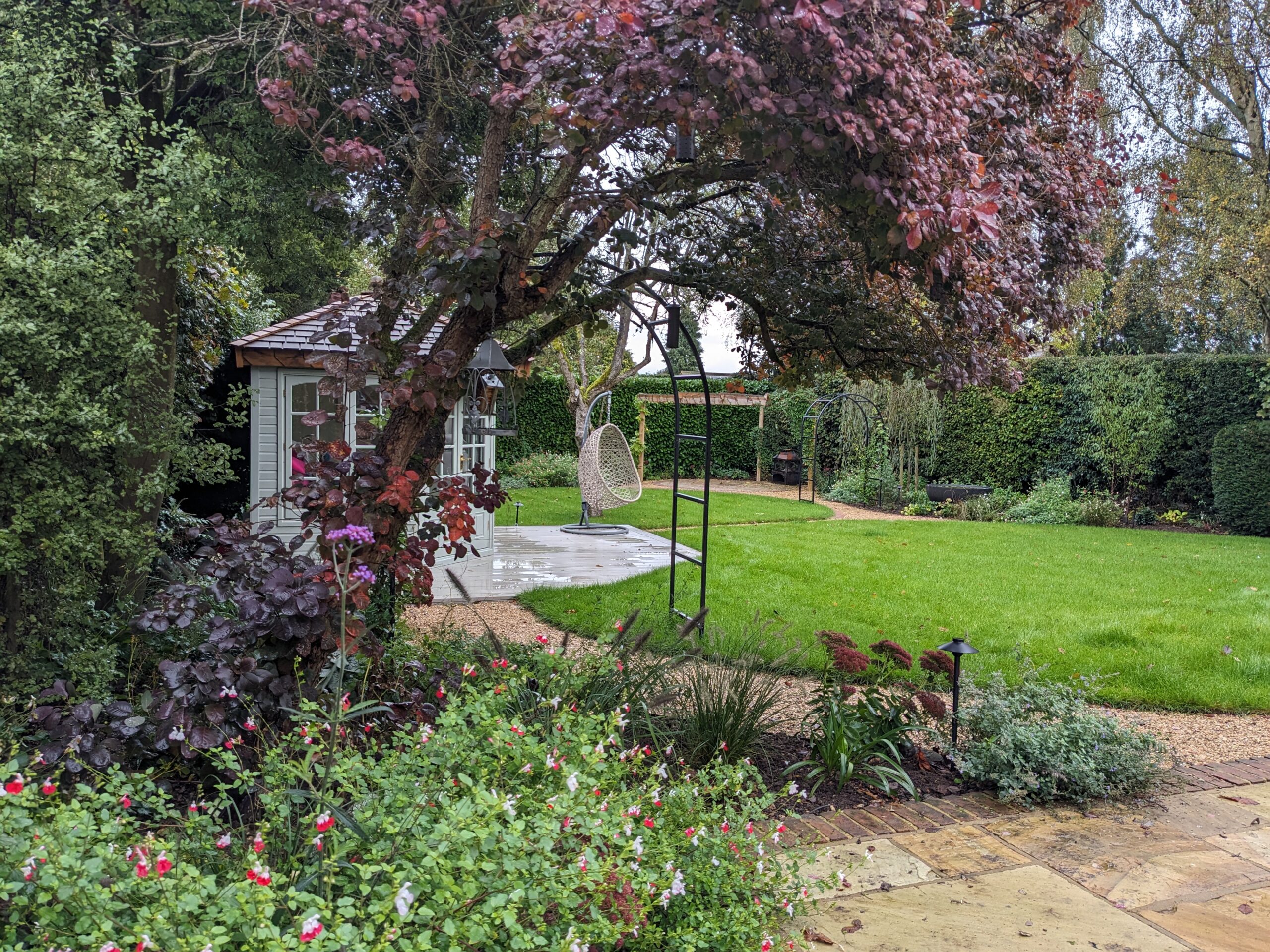 Another blank canvas. A garden surrounded but mature tall evergreen hedges. It needed a soft touch to draw attention to the existing trees. The circular lawn draws your eye to the various spaces to explore the garden, the new planting adds height and dimension, making use of the evergreen canvas