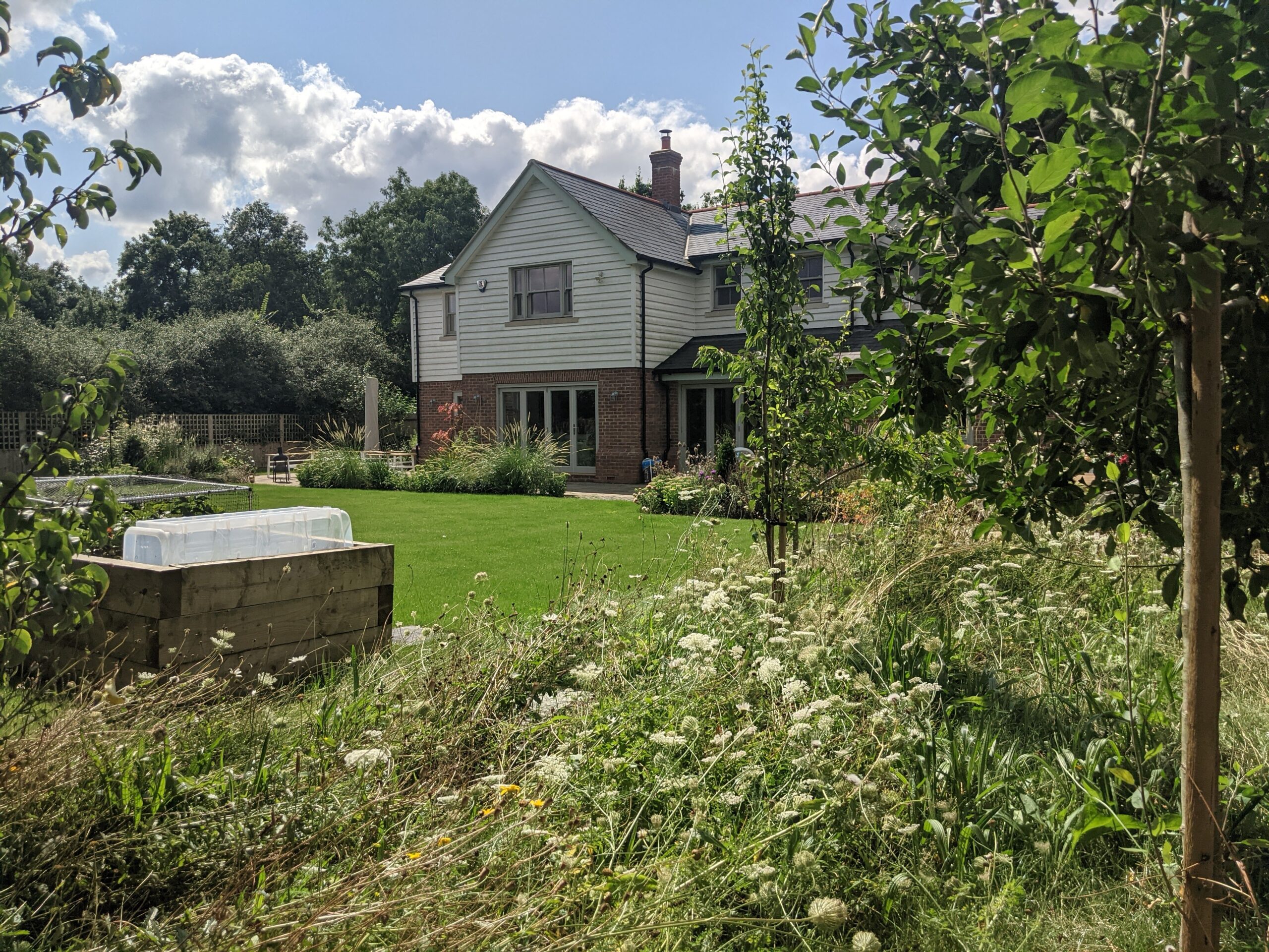 I developed a design that divided the garden into different zones.  The planting has made the biggest difference, it softens the patio and adds seasonal interest. The Orchard is underplanted with bulbs and meadow plants. The raised beds have been a success. A willow tepee provides a hiding place for the children.
